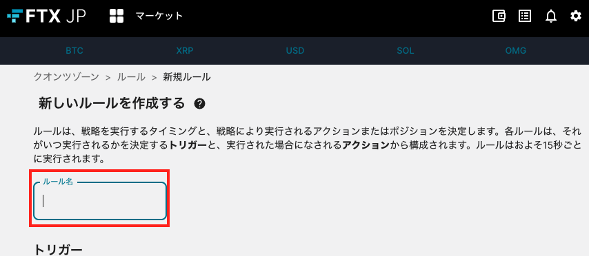 クオンツゾーンルールという画面に移行するため、「新しいルールを作成する」をクリックします。自動売買ルールの作成画面へと移行するため、ルール名を決めていきましょう。