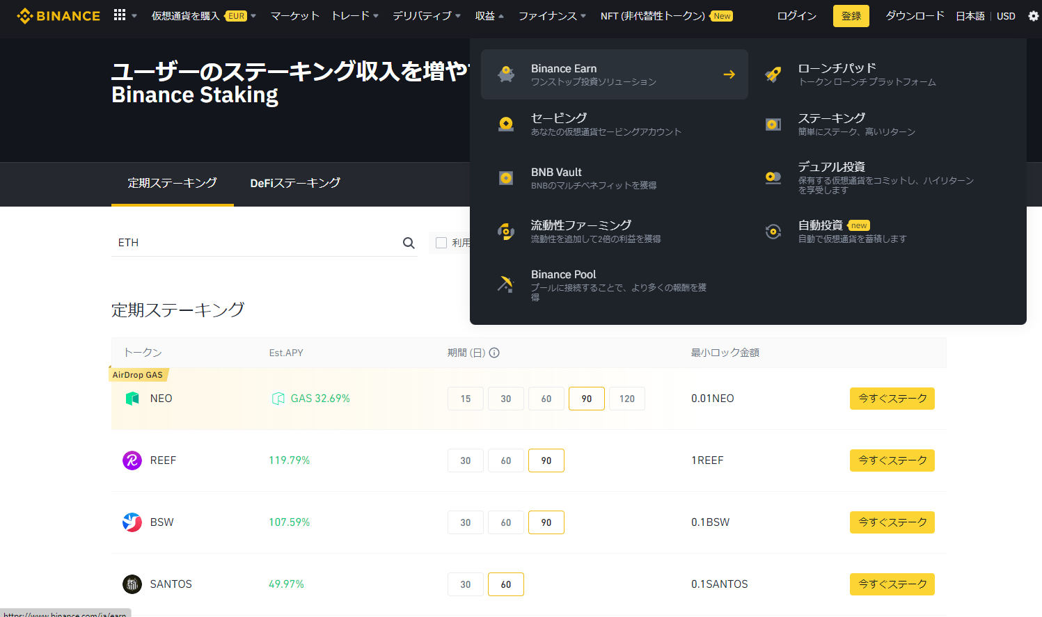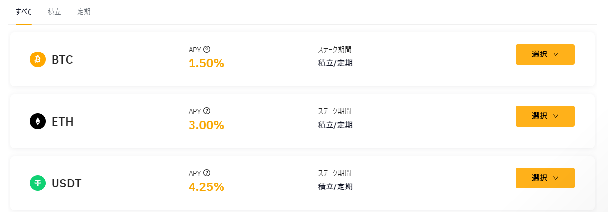 Binanceはイーサリアム以外にもさまざまな仮想通貨をステーキングできます。(2023年4月25時点)